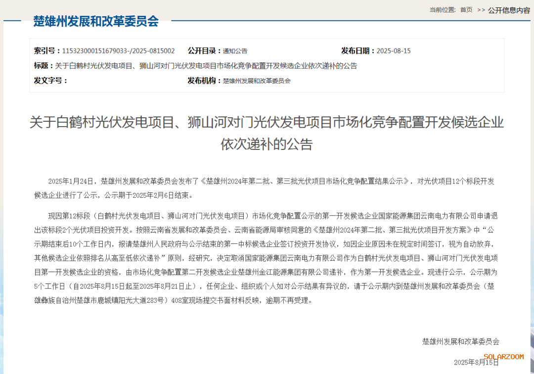公告指出,2025年1月24日,楚雄州发展和改革委员会发布了《楚雄州2024年第二批、第三批光伏项目市场化竞争配置结果公示》,对光伏项目12个标段开发候选企业进行了公示,公示期于2025年2月6日结束。