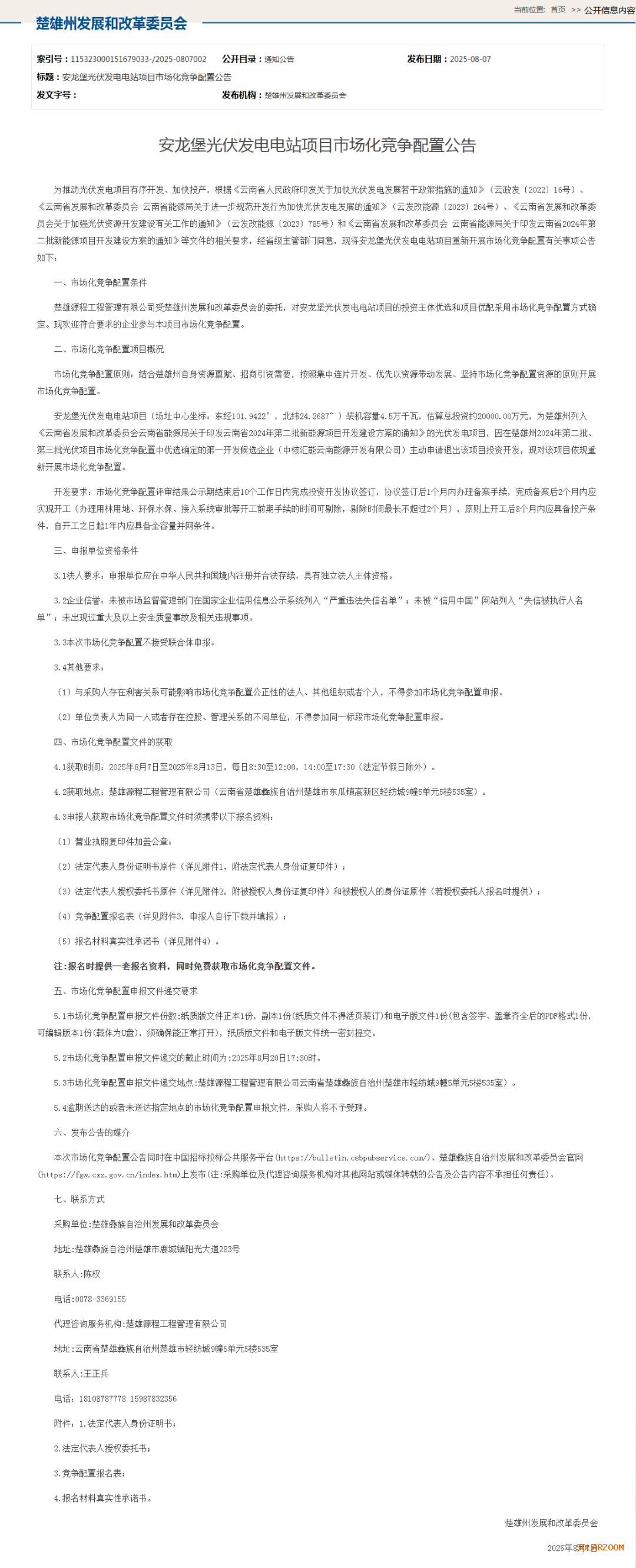 8月7日,楚雄州发展和改革委员会发布安龙堡光伏发电电站项目市场化竞争配置公告。