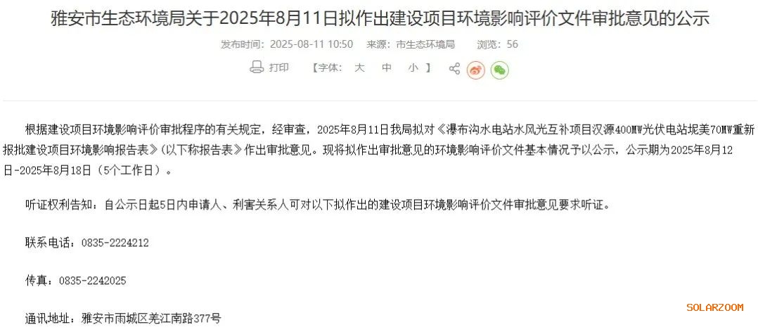 8月11日-12日,四川省雅安市生态环境局发布“瀑布沟水电站水风光互补项目汉源400MW光伏电站坭美70MW重新报批建设项目”环评拟批准公示;