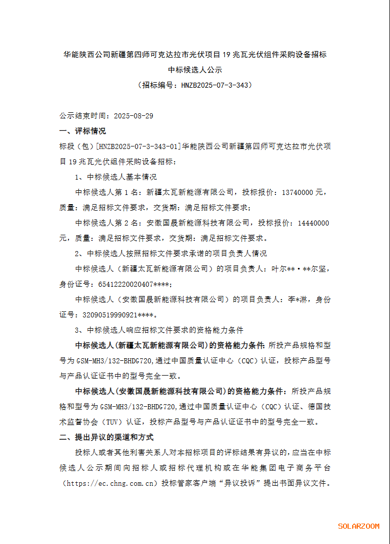 8月27日消息,华能陕西公司新疆第四师可克达拉市光伏项目19兆瓦光伏组件采购设备招标候选人公示。