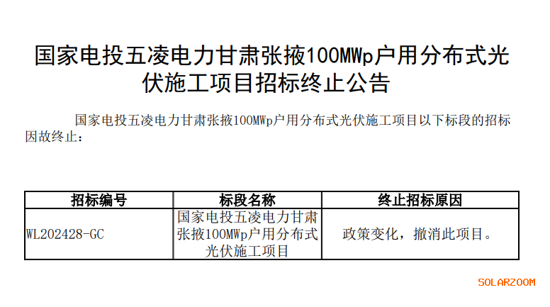 8月21日,国家电投五凌电力甘肃张掖100MWp户用分布式光伏施工项目发布终止公告,终止原因为政策变化!