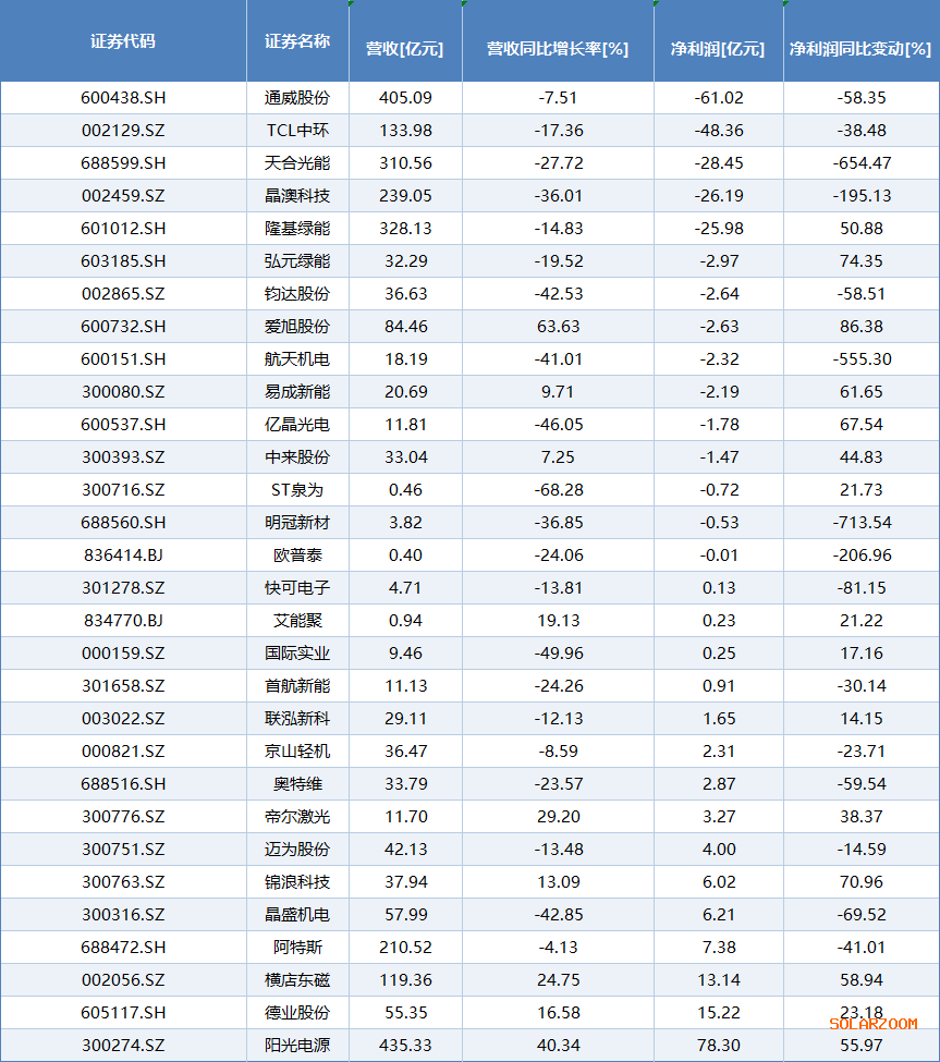 如,隆基绿能营收同比下降14.83%,净亏损25.69亿元,通威营收同比下降7.51%,亏损49.55亿元,晶澳营收同比下降36.01%,亏损25.8亿元,TCL中环营收同比下降17.36%,净亏损42.42亿元,协鑫预亏2.5亿元。