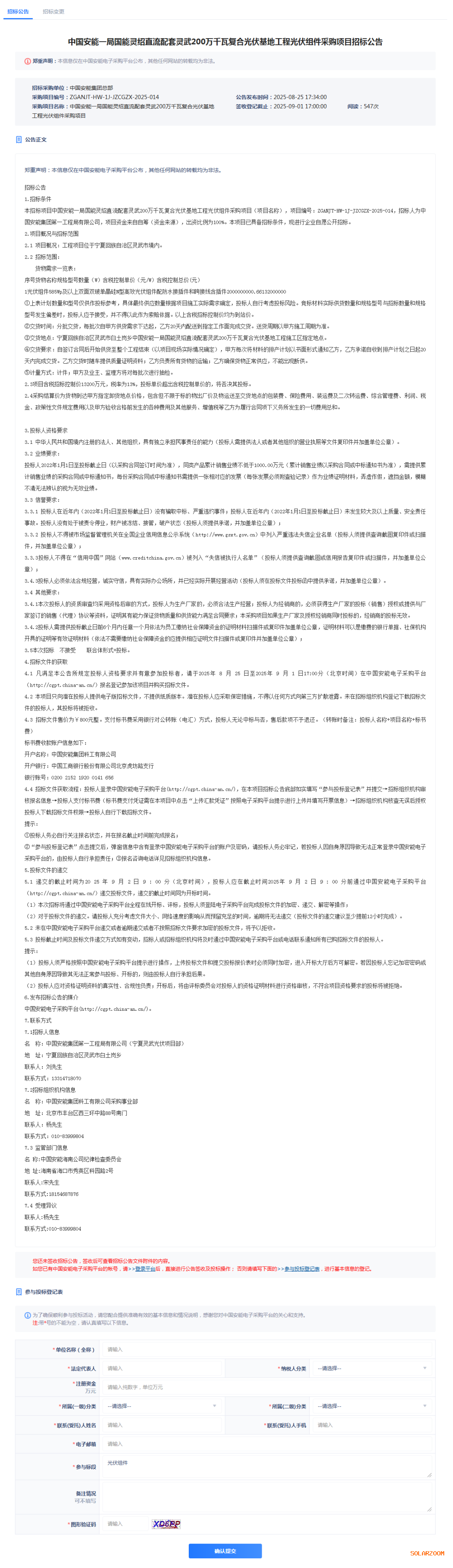 记者获悉,8月25日,中国安能一局国能灵绍直流配套灵武200万千瓦复合光伏基地工程光伏组件采购项目招标公告发布。
