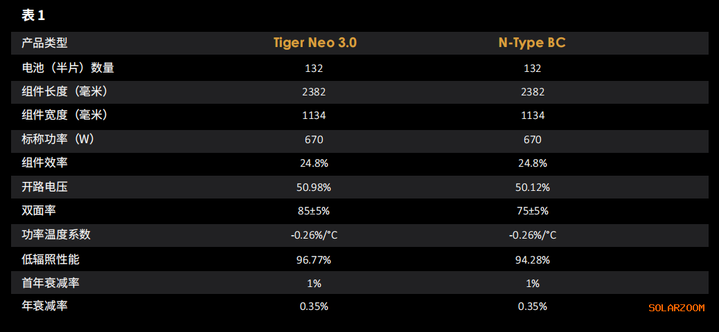 本研究旨在比较Tiger Neo 3.0与N型BC组件在不同应用场景下的LCOE水平。研究假设两者组件价格一致,具体组件参数如表1所示。试验选取了四类项目场景(两类屋顶分布式项目、两类大型地面电站),并覆盖四种典型气候条件、辐照度水平和系统平衡(BOS)成本水平的地区。