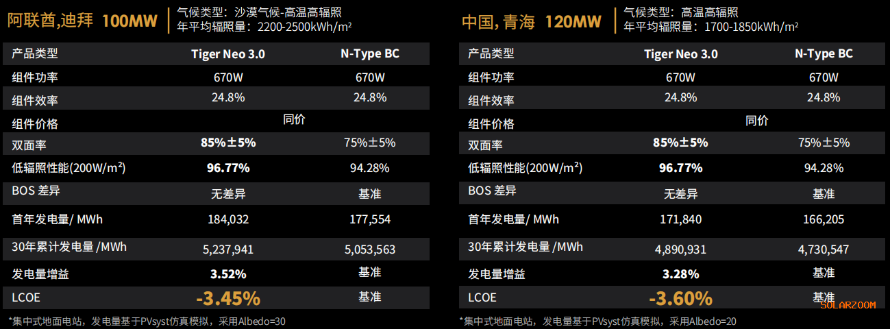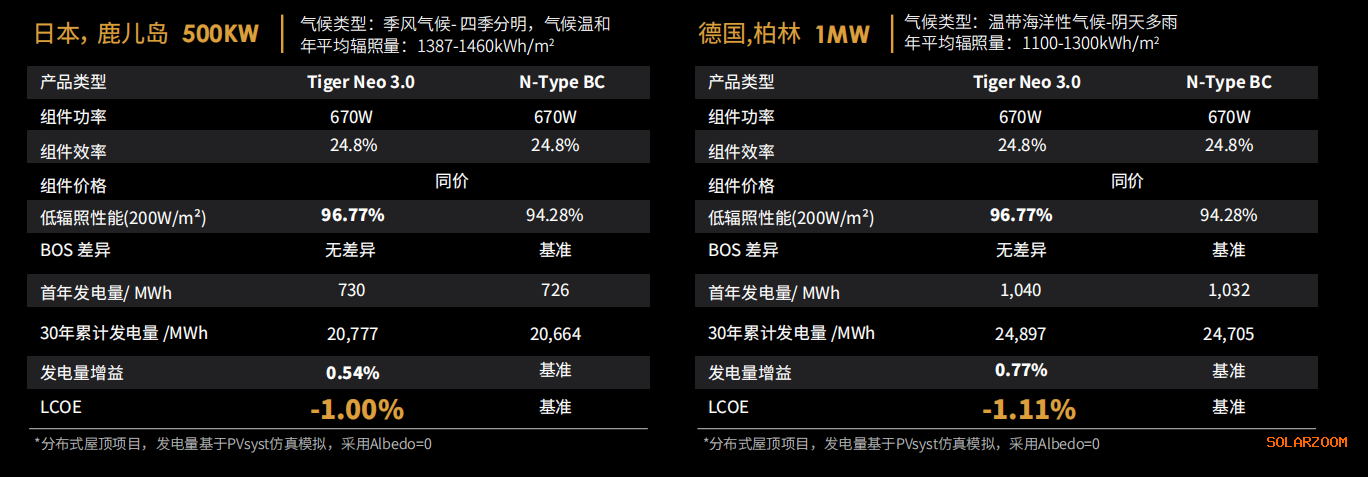 数据模拟通过PVsyst软件完成:Tiger Neo 3.0的PAN文件数据基于基于晶科能源提供的实测性能,N型BC则参考行业通用水平。