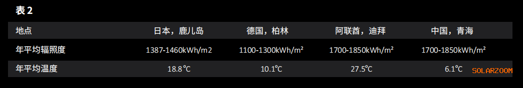 研究选择了四个典型地区展开分析,分别是日本鹿儿岛、德国柏林、阿联酋迪拜、和中国青海,各地区年平均辐照度与年平均温度如表2所示。