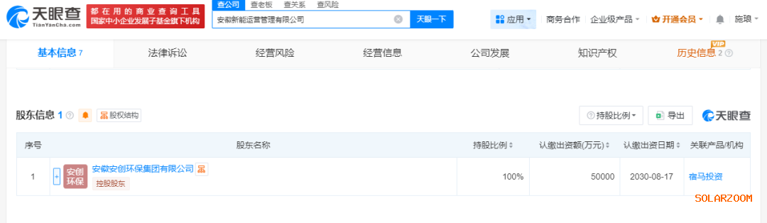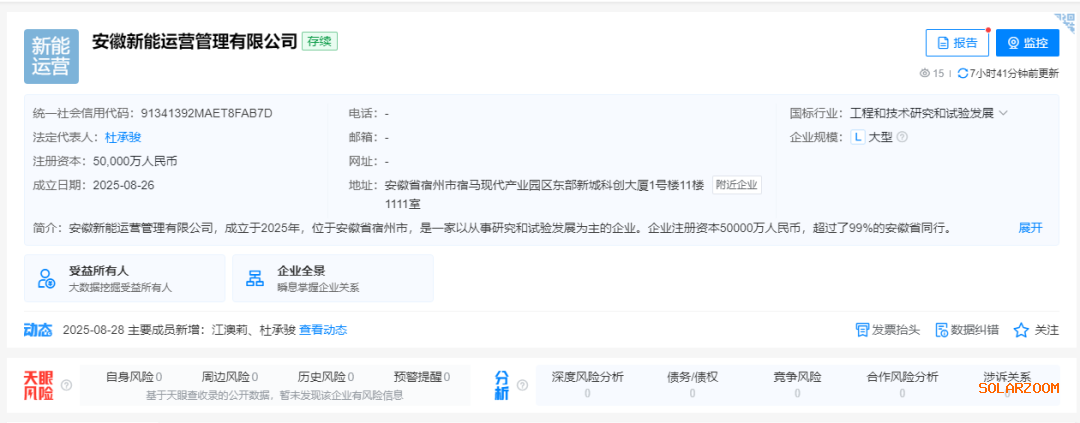 近日,安徽新能运营管理有限公司成立,注册资本5亿元,经营范围包含:储能技术服务;光伏设备及元器件制造;光伏设备及元器件销售等。