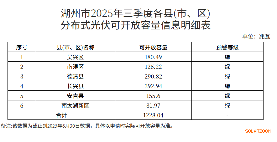 日前,湖州市发展和改革委员会关于湖州市2025年三季度分布式光伏可开放容量公示。