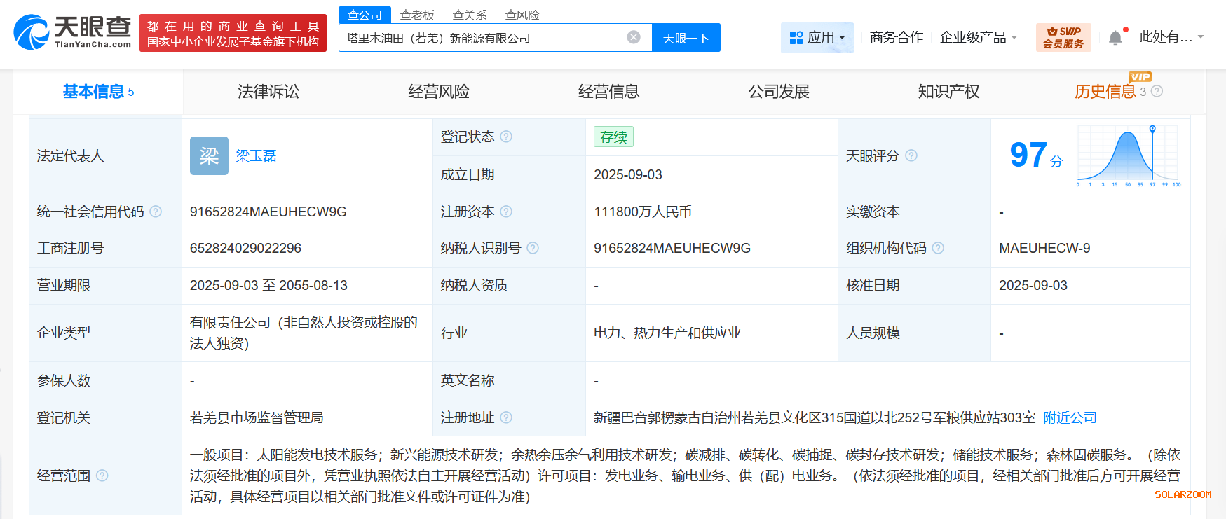 天眼查工商信息显示,近日,塔里木油田(若羌)新能源有限公司成立,法定代表人为梁玉磊,注册资本11.18亿人民币,经营范围含太阳能发电技术服务,新兴能源技术研发,余热余压余气利用技术研发,碳减排、碳转化、碳捕捉、碳封存技术研发,储能技术服务,森林固碳服务等。股东信息显示,该公司由中石油太湖(北京)投资有限公司全资持股。