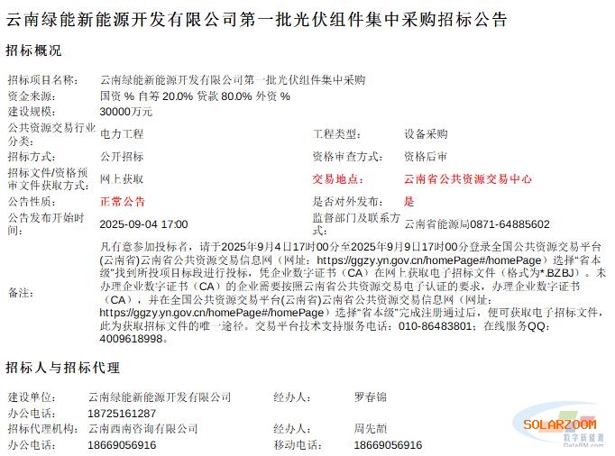 9月4日,云南绿能新能源开发有限公司第一批光伏组件集中采购招标公告发布,项目建设单位为云投集团旗下企业云南绿能新能源开发有限公司。
