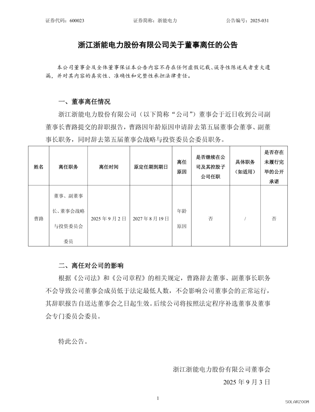 9月2日,浙能电力发布公告称,浙江浙能电力股份有限公司董事会于近日收到公司副董事长曹路提交的辞职报告,曹路因年龄原因申请辞去第五届董事会董事、副董事长职务,同时辞去第五届董事会战略与投资委员会委员职务。