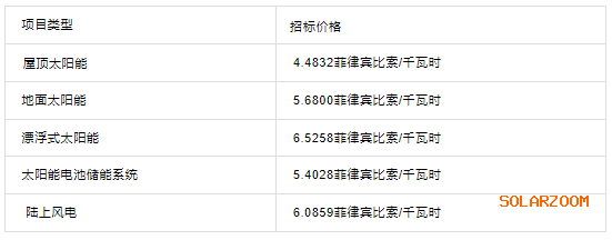 菲律宾能源监管委员会为本次招标设定的底价分别为:屋顶太阳能4.4832菲律宾比索/千瓦时(约合0.079美元/千瓦时)、地面安装式太阳能5.6800菲律宾比索/千瓦时、漂浮式太阳能6.5258菲律宾比索/千瓦时、陆上风电6.0859菲律宾比索/千瓦时、太阳能电池储能系统5.4028菲律宾比索/千瓦时。