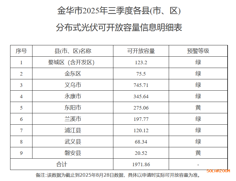 浙江金华市公示2025年三季度各县(市、区)分布式光伏可开放容量,根据信息明细表显示:7个县(市、区)预警等级为绿色,2个县(市、区)预警等级为黄色,9个县(市、区)可开放容量为1971.86MW。
