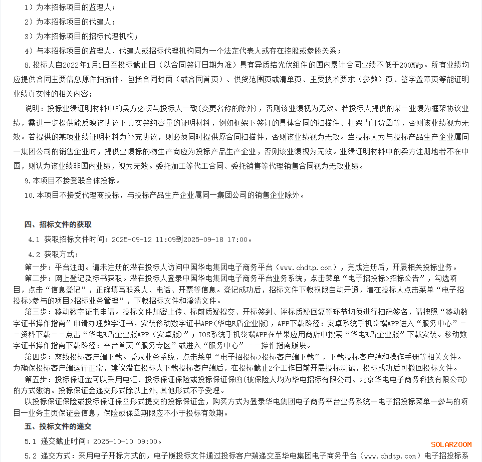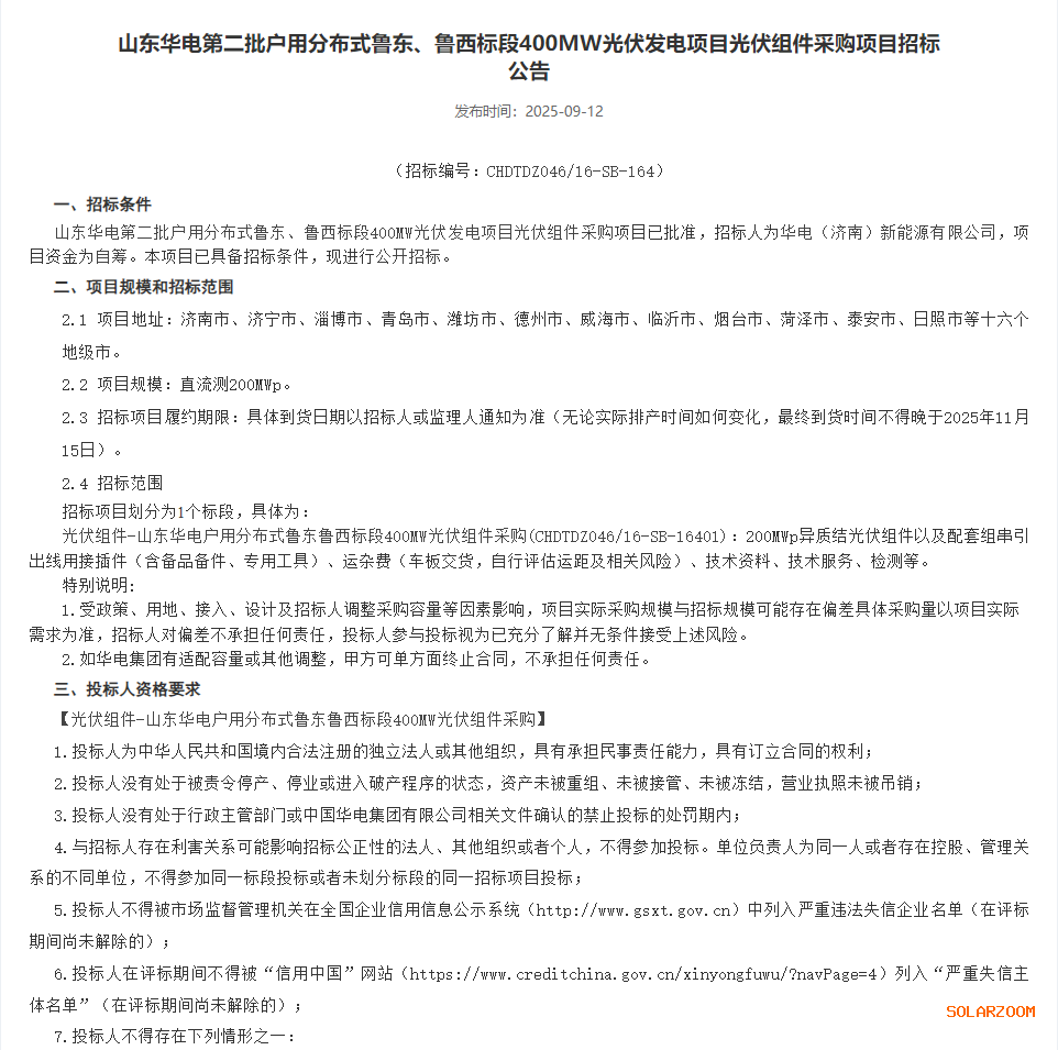 9月12日中国华电电子商务平台发布《山东华电第二批户用分布式鲁东、鲁西标段400MW光伏发电项目光伏组件采购项目招标公告》,项目招标人为华电(济南)新能源有限公司,项目规模为直流侧200MWp异质结光伏组件以及配套组串引出线用接插件等。