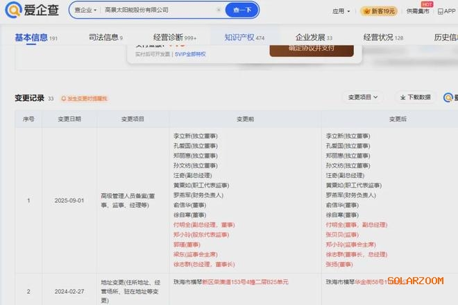 爱企查显示,9月1日,高景太阳能股份有限公司(简称“高景太阳能”)进行了高级管理人员备案(董事、监事、经理等)变更。