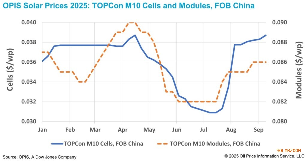 道琼斯旗下的OPIS在最新全球太阳能市场报告中指出,中国FOB TOPCon M10电池片本周上涨1.04%,至0.0387美元/瓦,报价区间在0.0362至0.0401美元/瓦之间。自7月初年内低点以来,TOPCon电池片价格累计上涨24.4%。