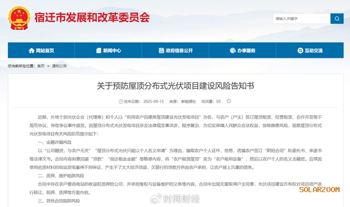 9 月 15 日,宿迁市发展和改革委员会发布《关于预防屋顶分布式光伏项目建设风险告知书》(以下简称《告知书》)称,外地个别光伏企业(代理商)及个人以 “利用农户自建房屋顶建设光伏发电项目” 为名,与农户签订不规范协议引发争议事件频发。鉴于屋顶分布式光伏项目涉及法律事项多、程序复杂,为切实保障群众合法权益,排除隐患风险,明确提示四大类风险,并给出具体防范建议。