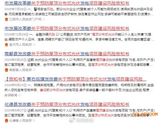 时间财经注意到,此前,多地政府部门发布相关风险告知书,明确提示相关风险。2025 年 8 月,工业和信息化部、国家发展改革委等六部门联合召开光伏产业座谈会,明确提出打击虚假营销、低于成本价销售等违法违规行为。