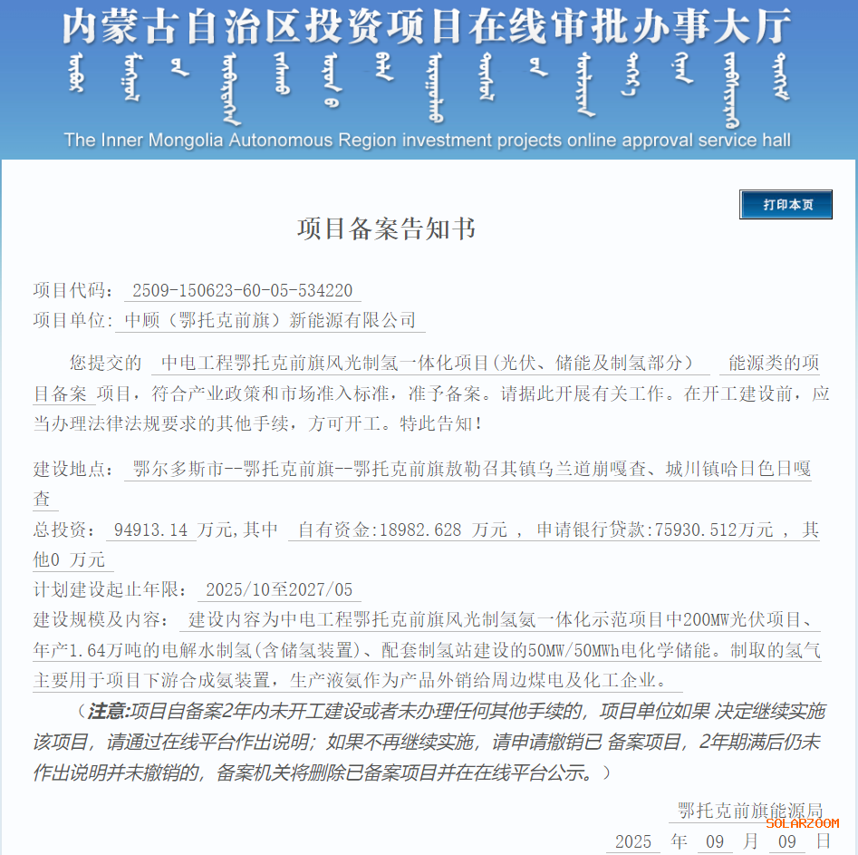 近日,内蒙古自治区投资项目在线审批办事大厅发布的信息中显示,中电工程鄂托克前旗风光制氢一体化项目(光伏、储能及制氢部分)获备案。
