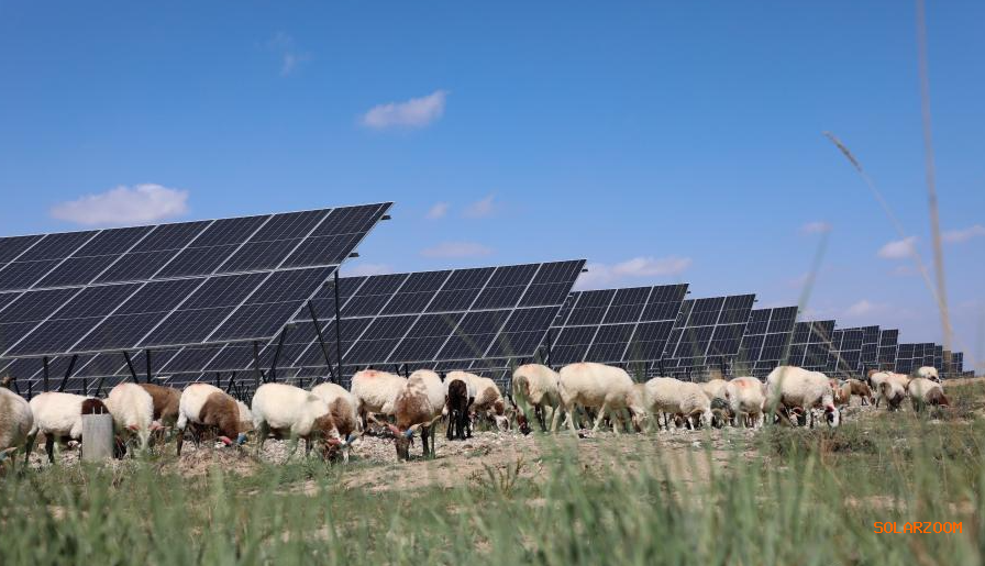 9月17日,“光伏羊”在园区内觅食。位于青海省海南藏族自治州共和县的塔拉滩光伏产业园区是目前全球装机容量最大的光伏发电园区。近年来,海南州依托该基地,实现“板上发电、板间种草、板下放牧”绿色发展,“光伏羊”存栏量已达2万余只。眼下正值“光伏羊”出栏季,牧民也将迎来丰收。