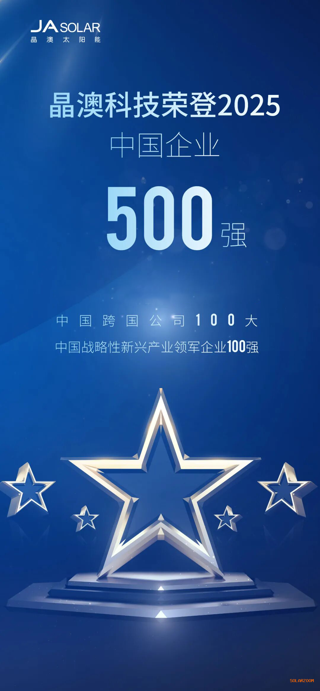 9月15日,中国企业联合会、中国企业家协会发布“2025中国企业500强”等榜单。晶澳科技以卓越的综合实力分别荣列“2025中国企业500强”第345位、“2025中国跨国公司100大”第73位、“2025中国战略性新兴产业领军企业100强”第67位。