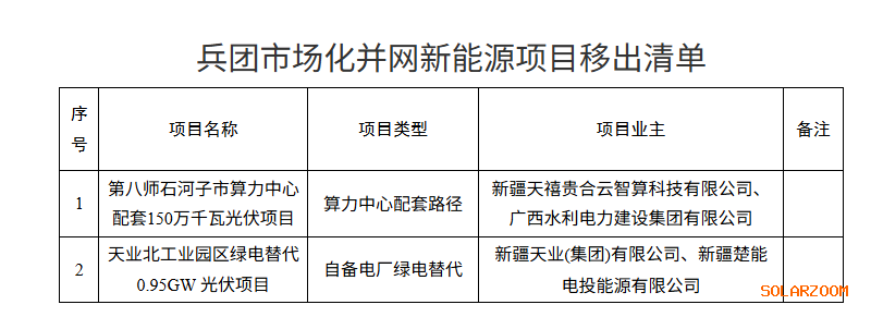 根据工作需要,新疆天禧贵合云智算科技有限公司、广西水利电力建设集团有限公司于9月22日向我委申报移出清单项目共1个,新疆天业(集团)有限公司、新疆楚能电投能源有限公司于9月24日向我委申报移出清单项目共1个。本次申请移出清单光伏发电项目装机容量2.45GW。现按工作程序予以公示,公示期为7天。