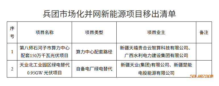 关于将第八师石河子算力中心配套150万 千瓦光伏项目、天业北工业园区绿电替代0.95GW光伏项目移出兵团市场化并网新能源项目清单的公示