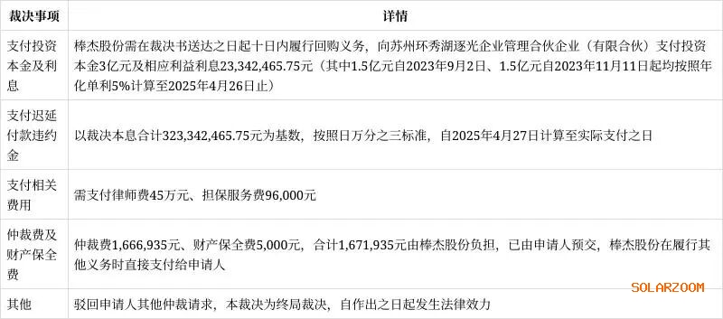 棒杰股份曾于2025年5月28日披露《关于累计诉讼、仲裁案件暨进展情况的公告》,当时公司收到苏州仲裁委员会送达的《仲裁申请书》《仲裁通知书》,苏州环秀湖逐光企业管理合伙企业(有限合伙)因与公司合同争议一案,向苏州仲裁委员会提出仲裁申请并获受理。近日,公司收到了相关《裁决书》。