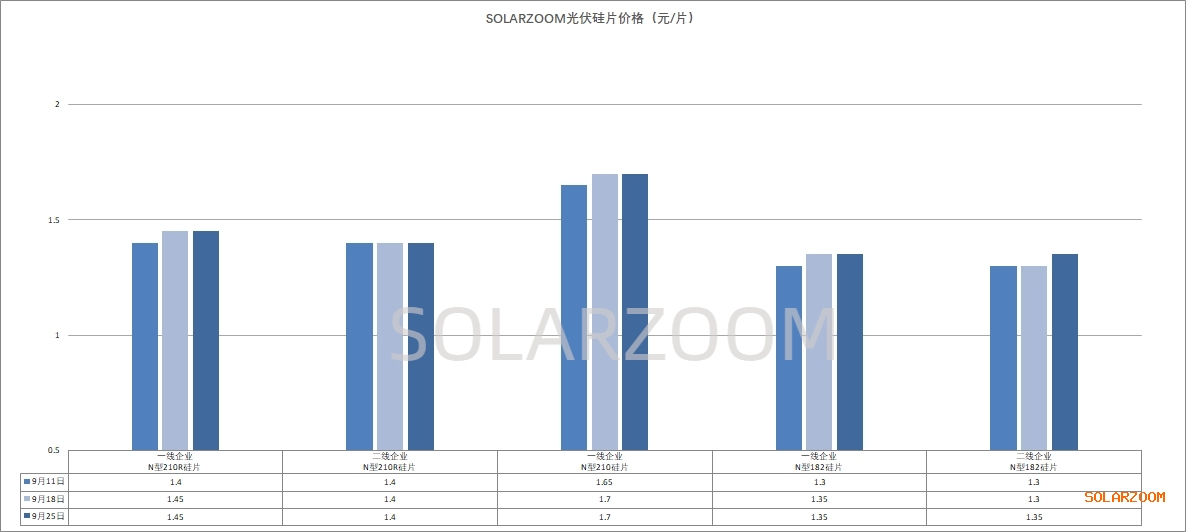 本周国内硅片价格暂未延续上涨趋势,各尺寸价格维持上周水平。上周在龙头硅片企业带领上调价格了各尺寸硅片价格,其中N型M10L、G12硅片在下游对应需求带动下已被接受成交,其他硅片企业也陆续已跟涨成交,本周N型M10L、G12硅片实际成交价格来至1.35、1.7元/片,对应各自的需求点也有差异,G12硅片需求主要受国内集中式项目带动,而M10L硅片对应需求点仍以抢出口为主。N型G12R方面,报价虽同步上涨,但截止目前在下游备货库存充足且硅片产出最多的情况下下游采购尚未接受涨价,当前成交价格仍在1.4元/片左右。十一临近,市场节前观望等待的情绪有所增加,但排产上主流硅片硅片企业暂未有降负荷生产计划,目前预计10月长假期间维持现有开工。HJT硅片方面,本周HJT半片报价也随着常规大尺寸硅片价格上涨而攀升,报价来至0.8元/片以上,但下游HJT电池产线除有海外出口需求的企业排产略高外其他HJT电池产线排产很低,对应HJT硅片需求也较少。