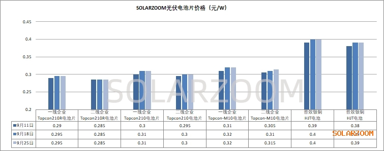 本周上在上游环节价格未有变动趋稳下,电池价格也暂未继续上涨,本周维稳,上周顺涨的部分尺寸电池进一步被下游成交接受落地。在对应下游需求带动下,N型M10L、G12电池价格随着上周上游硅片价格顺涨至0.315-0.32、0.30-0.31元/W,成交价格逐步趋于区间高位,其中N型M10L电池主要需求仍来自于海外拉动,而G12电池需求在国内下游终端部分集中式项目启动带动下而有所提升,供给结构性紧张下仍有上涨空间。N型G12R电池方面,本周成交价格仍落在0.285-0.29元/W区间,上周上涨0.05元/W的价格仍未被下游接受。电池端价格上涨多为上游硅片涨价,成本推动因素为主,而电池价格向组件环节传导受阻不减,十一长假将近部分电池厂商计划放假略降生产负荷,其中基本为产出最多的G21R产线。HJT电池方面,当前国内HJT电池产线排产未有太大波动,面对下游现有的HJT电池需求以及HJT电池成本下,HJT电池在产企业坚挺价格意愿明显,当前HJT电池国内价格在上游硅片推涨下同步顺涨,本周报价来至0.4元/W以上,但实际成交有限。