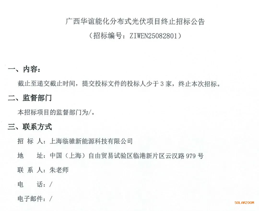 9月18日,广西华谊能化分布式光伏项目发布终止招标公告,公告显示,由于项目截止至递交截止时间,提交投标文件的投标人少于3家,故终止本次招标。项目招标人为上海临骓新能源科技有限公司。