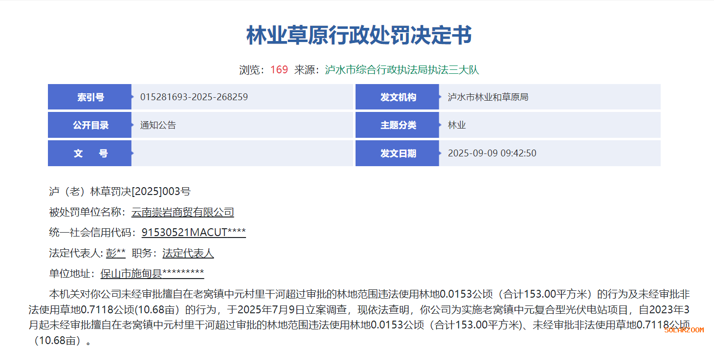 处罚决定书显示,泸水市林业和草原局对该公司未经审批擅自在老窝镇中元村里干河超过审批的林地范围违法使用林地0.0153公顷(合计153.00平方米)的行为及未经审批非法使用草地0.7118公顷(10.68亩)的行为,于2025年7月9日立案调查,现依法查明,该公司为实施老窝镇中元复合型光伏电站项目,自2023年3月起未经审批擅自在老窝镇中元村里干河超过审批的林地范围违法使用林地0.0153公顷(合计153.00平方米)、未经审批非法使用草地0.7118公顷(10.68亩)。上述行为及事实有鉴定意见书、询问笔录、现场照片等证据为证。2025年8月28日,泸水市林业和草原局送达了《林业草原行政处罚先行/听证权利告知书》