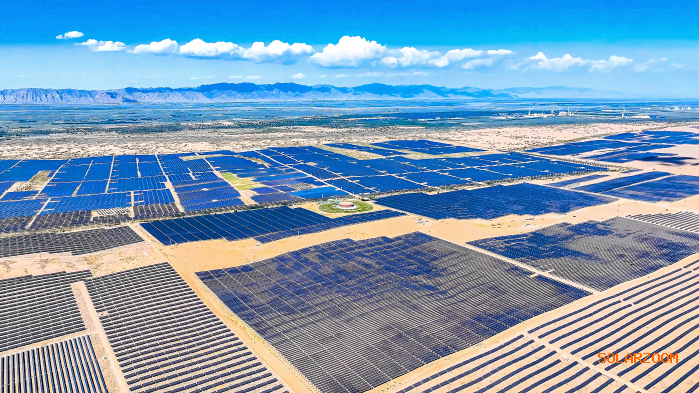 杜洪光介绍,蒙西基地库布其200万千瓦光伏治沙项目,2022年6月开工建设,2023年12月竣工并网发电,项目年均发电41亿千瓦时,相当于节约123万吨标准煤,减少319.8万吨二氧化碳排放,每年还能为黄河“减负”200万吨泥沙。