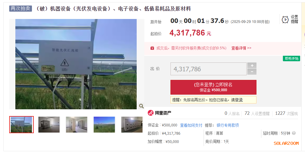 据阿里资产拍卖平台显示,9月29日,大唐尖山天硕阿鲁科尔沁旗新能源有限公司管理人公开拍卖名下破产企业大唐尖山天硕阿鲁科尔沁旗新能源有限公司的机器设备(光伏发电设备)、电子设备、低值易耗品及原材料等资产。