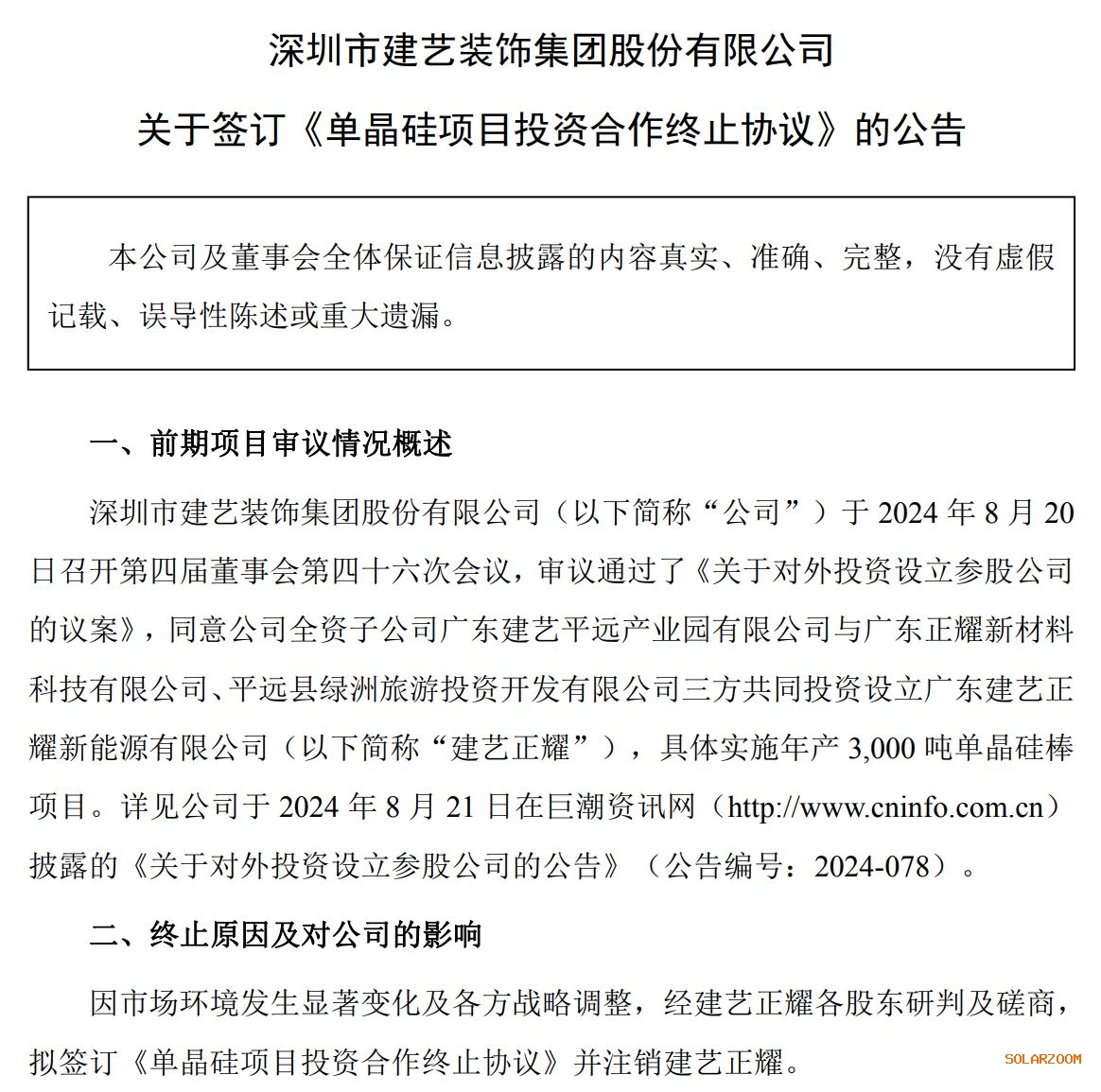 根据*ST建艺10月8日公告,公司决定签订《单晶硅项目投资合作终止协议》,并注销用于实施该项目的参股公司建艺正耀。公告将终止原因归结为“市场环境发生显著变化及各方战略调整,经建艺正耀各股东研判及磋商”。