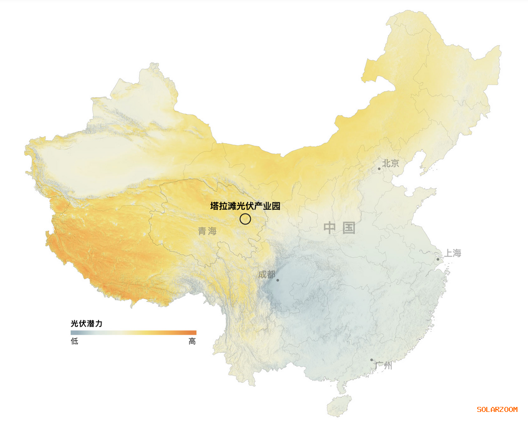主要的太阳能电站群——塔拉滩光伏产业园的规模令全球其他光伏集群相形见绌。它已覆盖420平方公里,位于地广人稀的青海共和县的高寒荒漠地带。