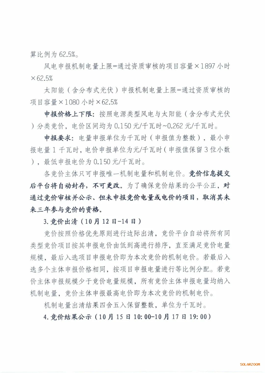 申报价格上下限:按照电源类型风电与太阳能(含分布式光伏)分类竞价,电价区间均为0.15元/千瓦时~0.262元/千瓦时。