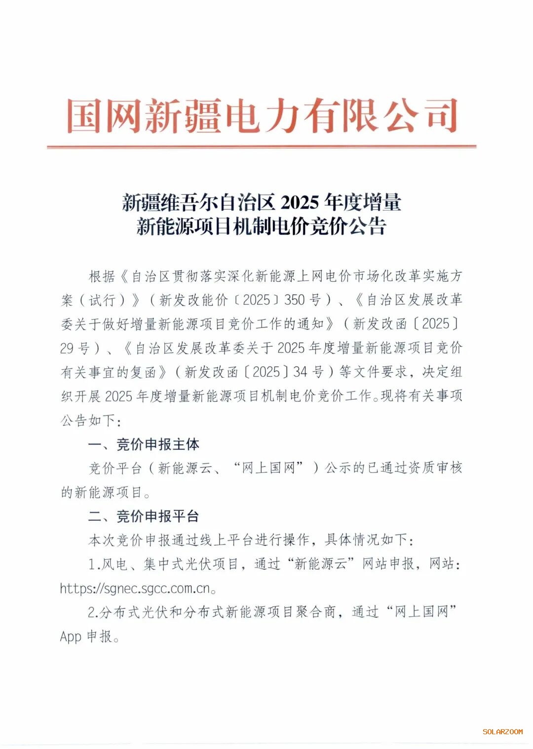 近日,国网新能源云平台发布《新疆维吾尔自治区2025年度增量新能源项目机制电价竞价公告》,新疆于10月10日10:00-10月11日19:00.参与竞价的风电、集中式光伏项目通过新能源云平台,分布式光伏和分布式新能源项目聚合商通过“网上国网”App申报电量、电价。