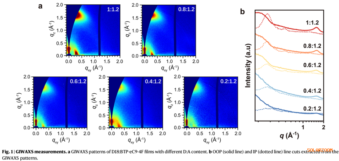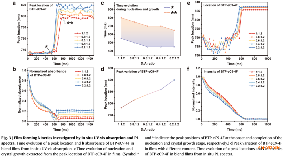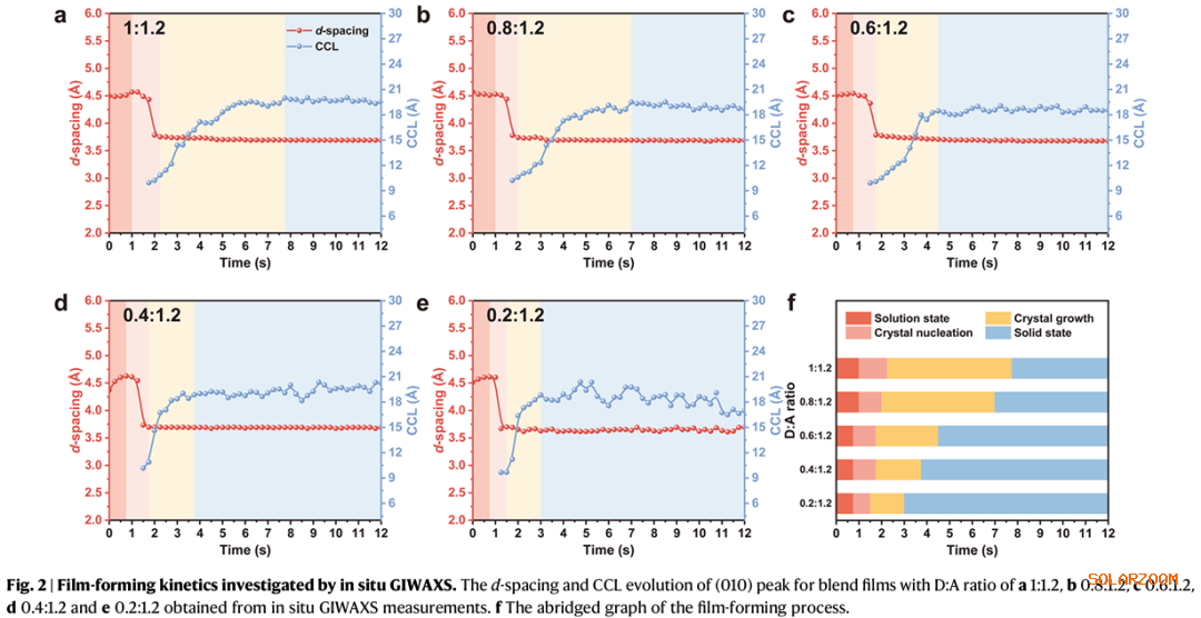 原位揭示薄膜演化机制:利用原位GIWAXS、UV-Vis与PL技术,实时追踪有机活性层从溶液到固态的结晶过程,明确给体含量对晶体成核、生长及分子取向的关键调控作用。