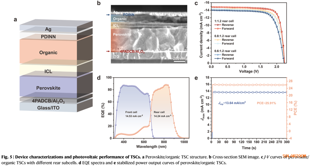 实现高效叠层器件:通过优化D:A比例,有效调控薄膜形貌与结晶行为,显著降低复合损失,最终制备出效率达26.42%的钙钛矿/有机叠层太阳能电池,为当前溶液加工型叠层器件的领先水平。