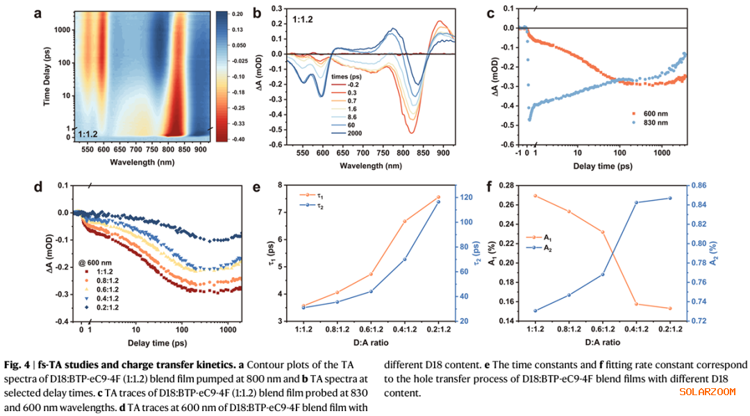 阐明给受体比例对性能的影响:发现给体含量不足会导致受体过度聚集、结晶质量下降,进而削弱激子解离与电荷传输,加剧复合损失,最终限制器件效率。