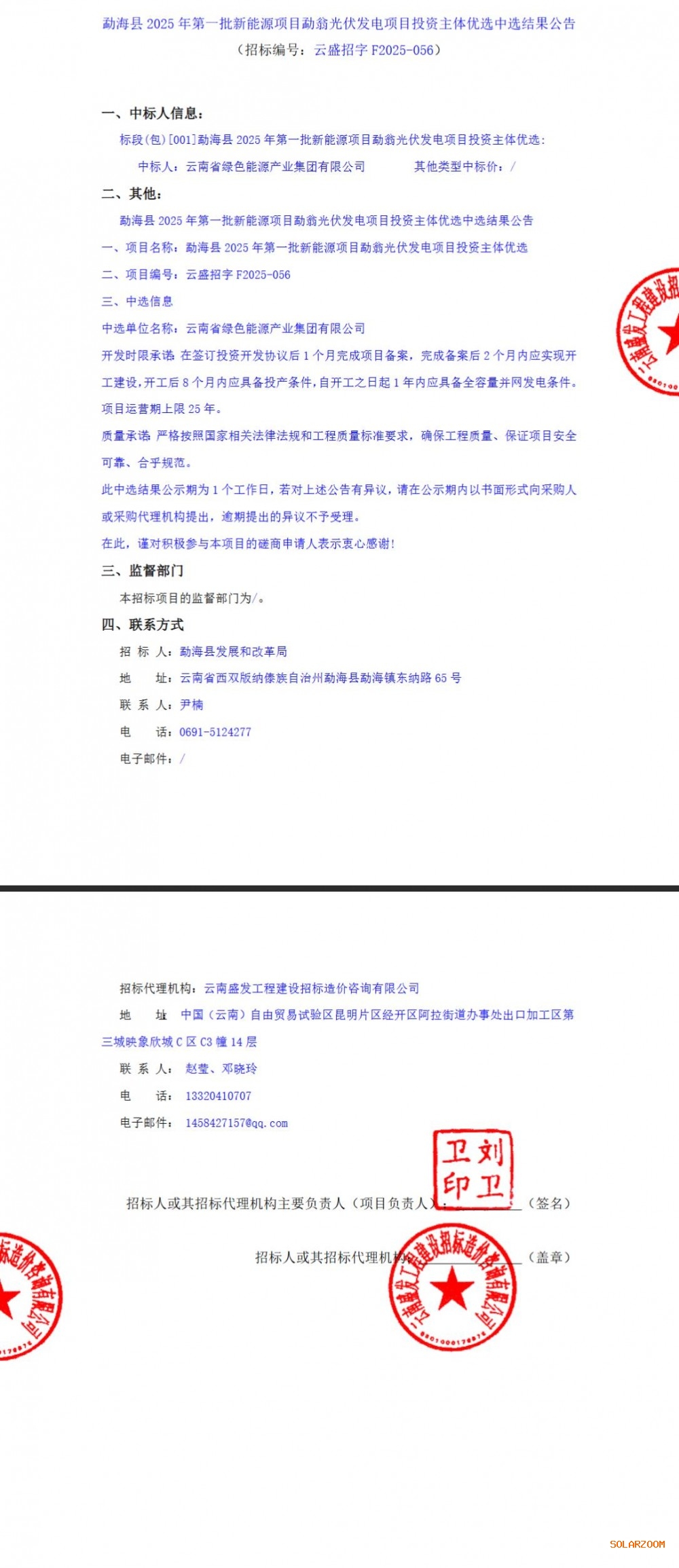 10月11日,勐海县2025年第一批新能源项目勐翁光伏发电项目投资主体优选中选结果公告发布,中标人为云南省绿色能源产业集团有限公司,由云南能投控股。