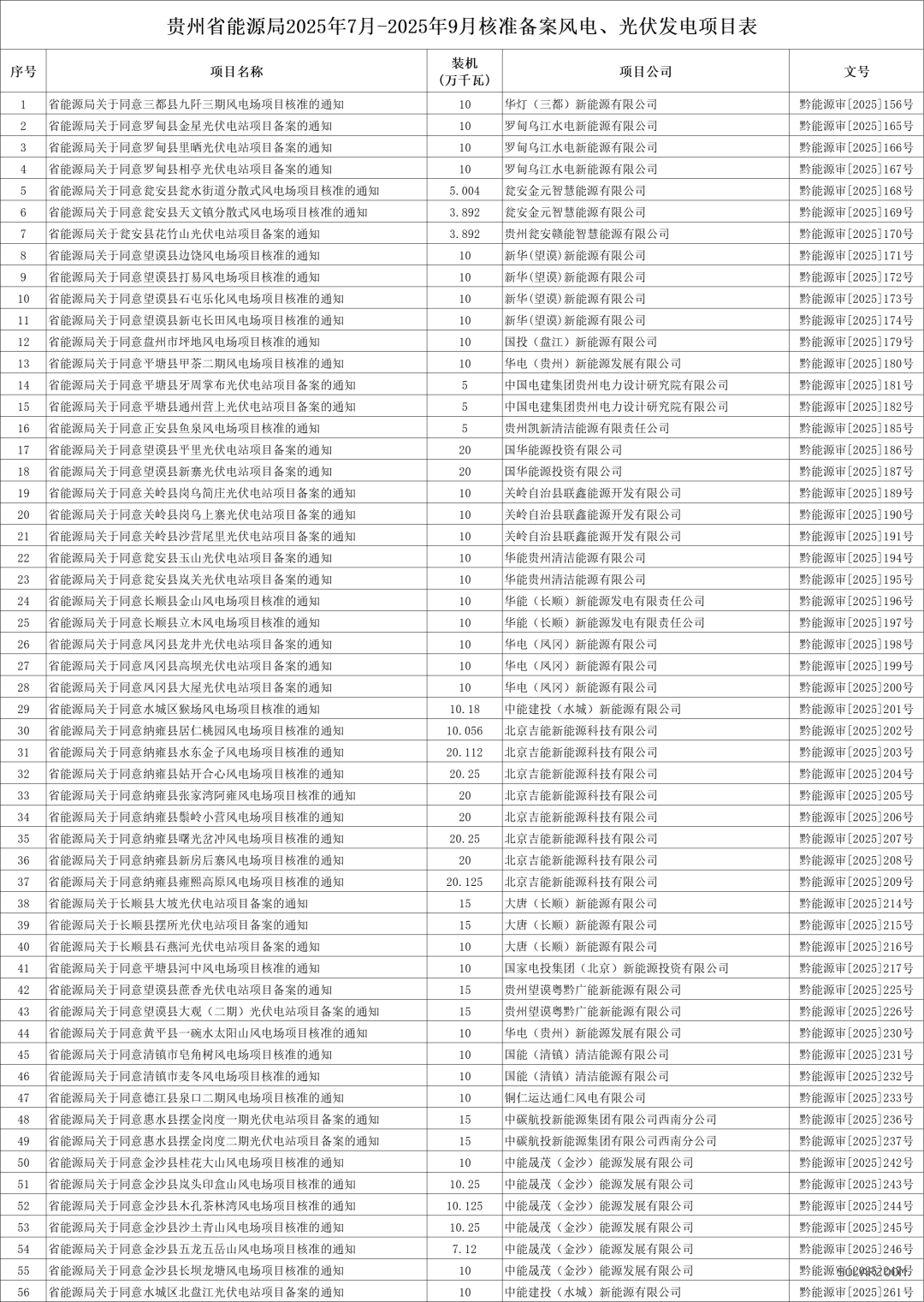 内容显示,贵州省能源局2025年7月-2025年9月核准备案风电、光伏发电项目56个,规模共计646.506万千瓦,其中,风电项目32个,规模合计372.614万千瓦,光伏项目24个,规模合计273.892万千瓦。