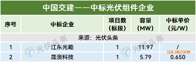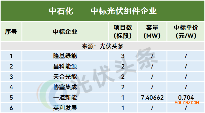 中国交建、中石化、鞍钢集团、华能、中国电气装备集团、中国能建、中国建材均有光伏组件项目定标。