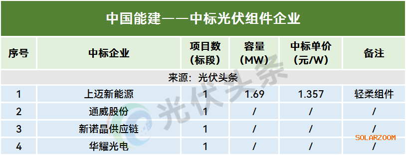 正泰新能、东方日升、隆基绿能、阿特斯、横店东磁、弘元绿能、环晟光伏、晶澳科技、晶科能源、欧达光电、赛拉弗、天合光能、通威股份、协鑫集成、一道新能、英利能源、正信光电、中清集团、爱旭股份、华晟新能源等20企入围该项目。