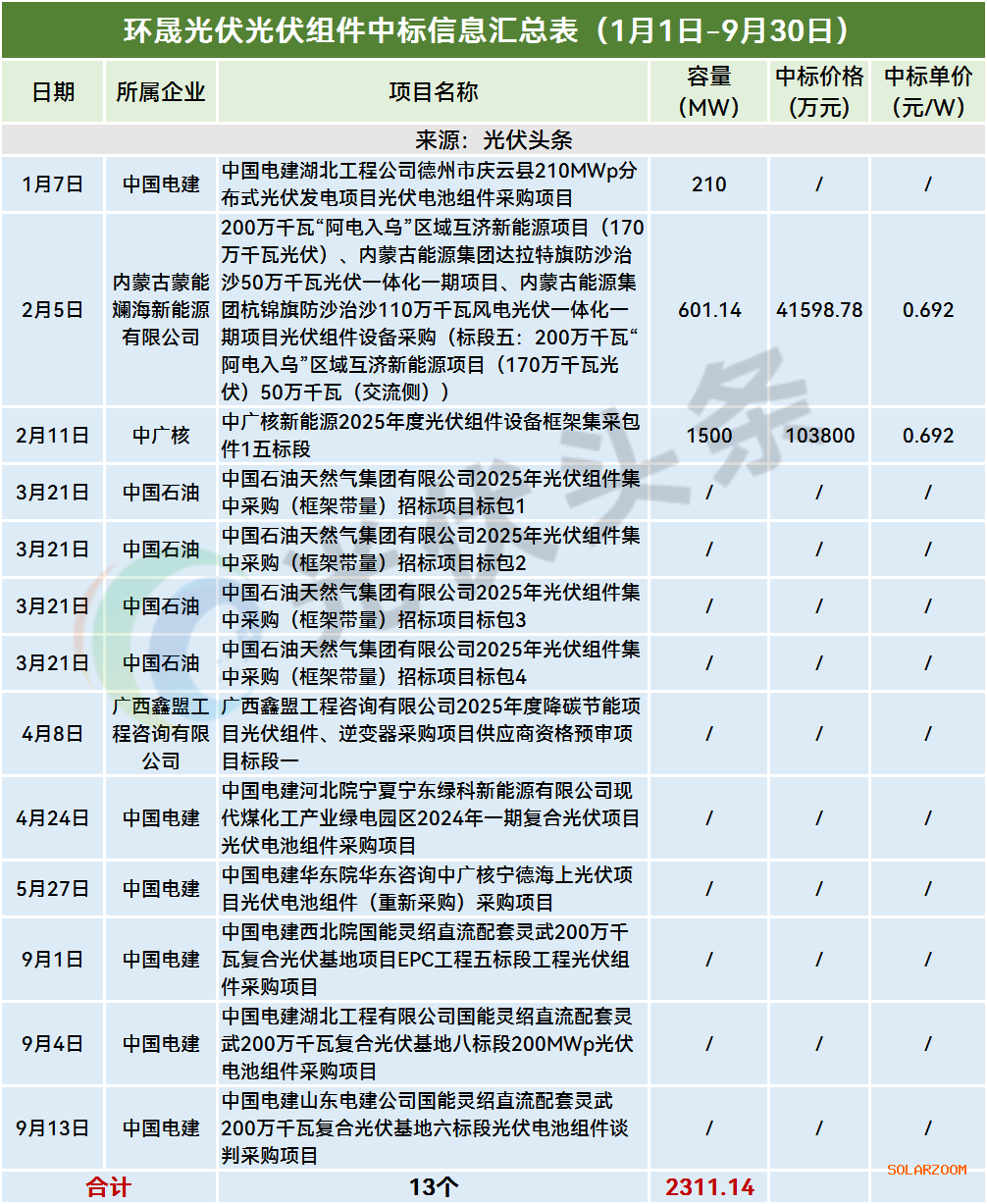 本统计周期,环晟光伏中标中国电建、中国石油、中广核等企业13个项目(标段),确定中标容量2311.14MW。