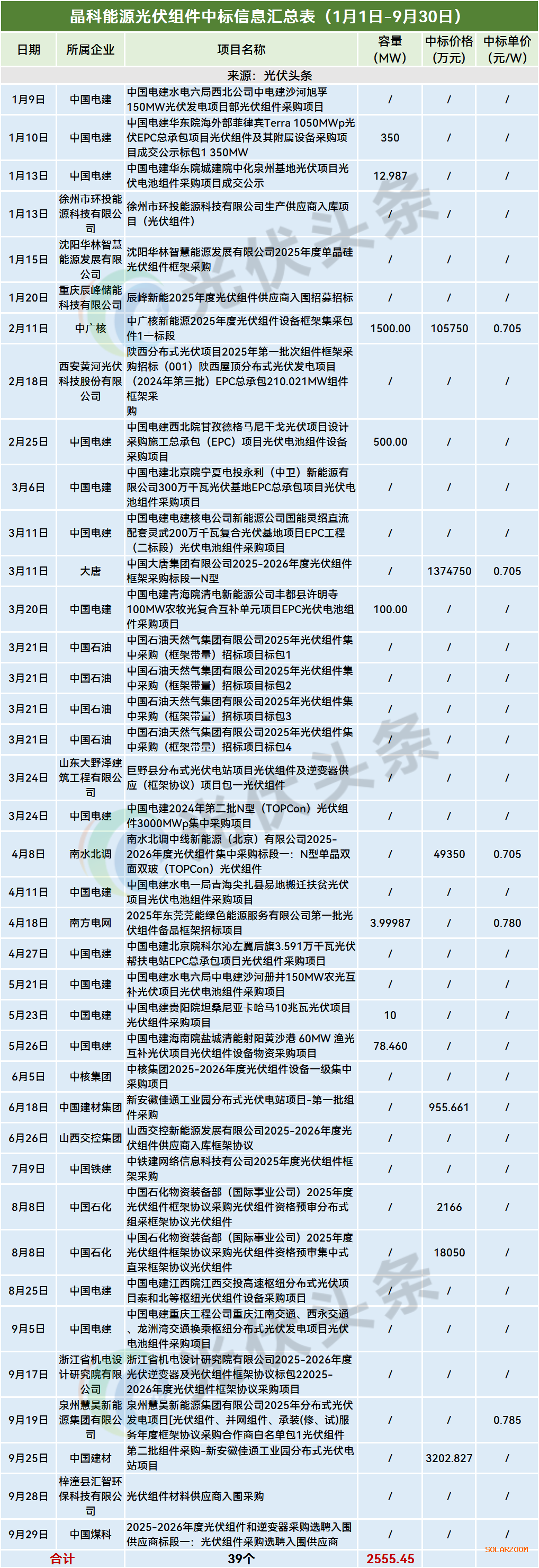 本统计周期,晶科能源中标中广核、中石油、黄河光伏、中国有色集团、中国电建、中国建材集团、中国铁建、中国石化、中国建材、中国煤科、山西交控集团等企业39个项目(标段),确定中标容量2555.45MW。
