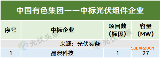 中国有色集团在本统计周期,有1个项目(标段)定标,容量27MW。晶澳科技中标。