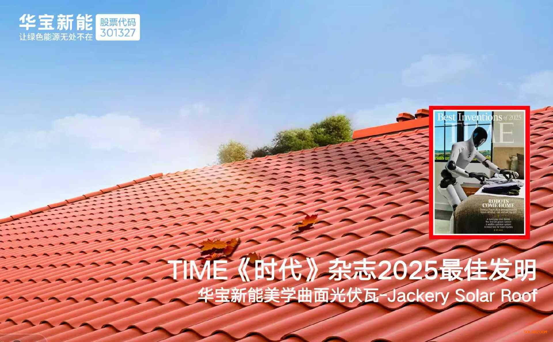 在全球能源转型加速推进、绿色建筑成为行业共识的背景下,华宝新能凭借持续的技术突破与前瞻性的产品布局,在绿色能源领域拥有举足轻重的地位。据悉,华宝新能自主研发的全球首款 XBC 晶硅多曲光伏瓦——美学曲面光伏瓦成功入选美国《时代周刊》(TIME)2025年“Best Inventions of the Year”(年度最佳发明榜单),华宝新能再次以创新能力驱动绿色能源变革,引领行业迈向美学与效能共生新时代。