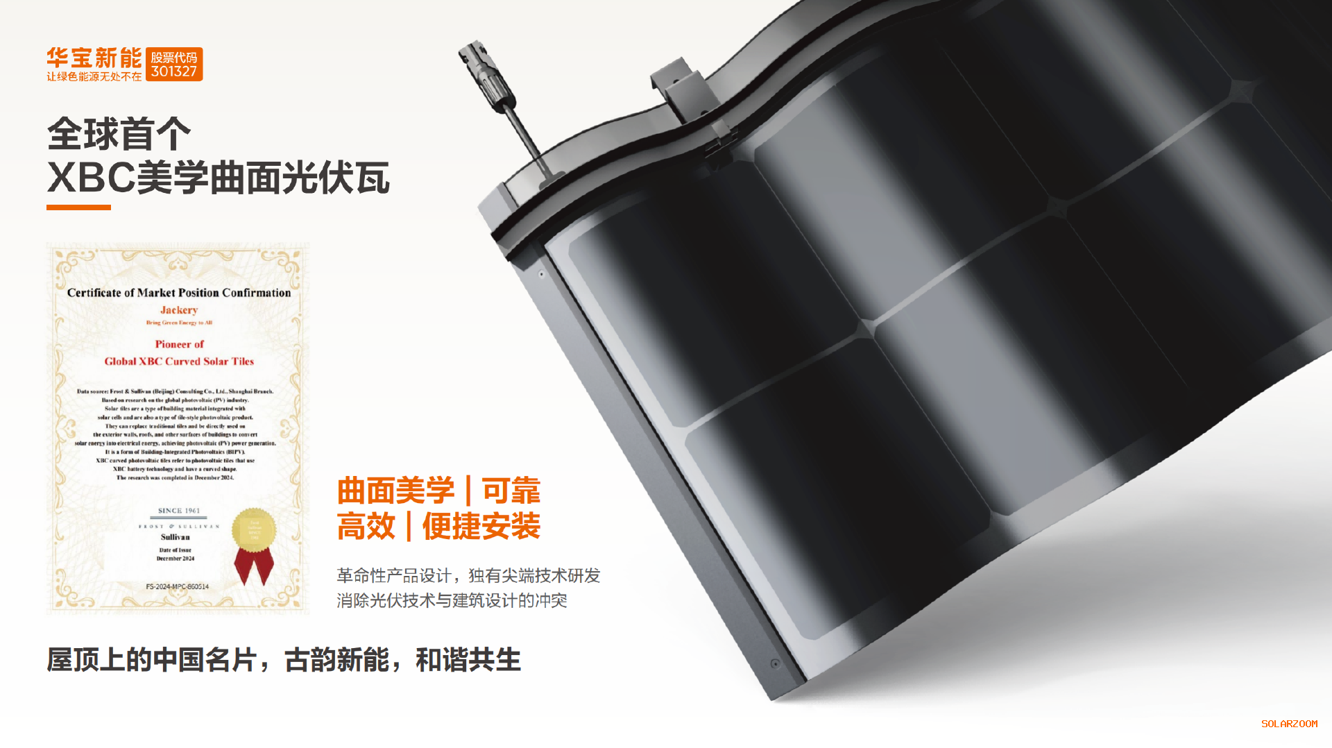 从行业痛点解决来看,传统光伏技术长期面临 “功能与美学”、“效率与适配” 的双重矛盾,在历史建筑密集区域甚至引发保护与能源改造的需求冲突,导致光伏与建筑的 “一体化” 停留在 “功能叠加” 层面。而华宝新能美学曲面光伏瓦的出现,以创新性解法消除了光伏技术与建筑设计的冲突,为户用光伏与建筑美学的融合提供可行路径,重塑了行业对光伏建筑一体化产品的认知与标准,推动 BIPV 领域从 “功能优先” 向 “美学与功能并重” 转型。